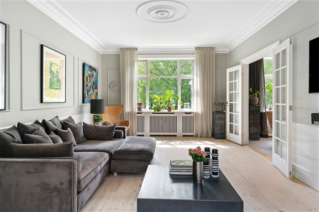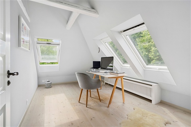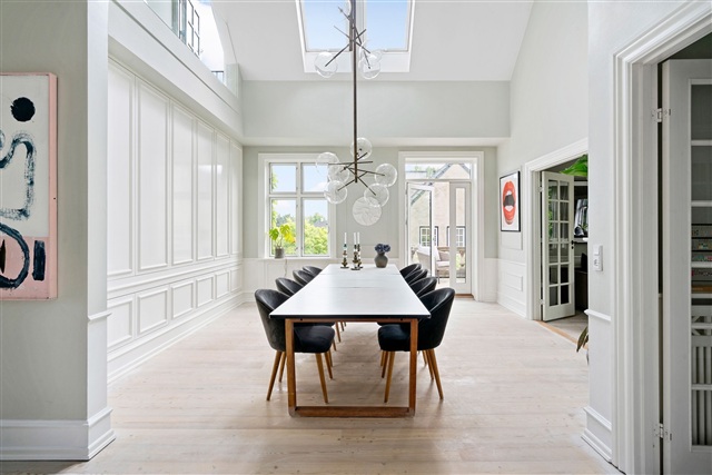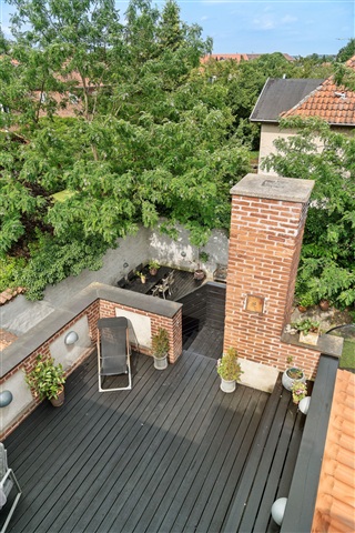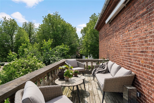 Som bekendt har Frederiksberg tradition for at hylde talenter og dygtige mennesker med deres navne på byens vejskilte. Respekt for dem og det. Men den danske grundlov bliver også applauderet med sit eget vejskilt, Femte Juni Plads. Ja, ret usædvanligt, især fordi der ikke er andre navne i Danmark med en dato som første led. Sikkert og vist er det, at Femte Juni Plads er lige så smuk som grundloven.Lejligheden på Femte Juni Plads ligger på 1. og 2. sal. Med 219 m2, delvist åbent til kip fra 1. sal, privat tagterrasse, altan, kælder og adgang til haven, er den en lejlighed med masser af plads. Ejendommen er fra 1928 bygget i murermesterperioden, som foreningen Bedre Byggeskik havde stor indflydelse på. De er typisk bygget som bolig for middelklassen i villakvarterer i en ring uden om de større byer, lidt længere ude end de første villakvarterer med patriciervillaer og byhuse.