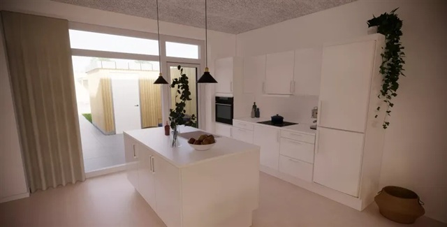 Med et rækkehus på Jordbærmarken kommer du tæt på naturen ved Fuglsang Sø, men stadig i overskuelig afstand til indkøbsmuligheder, pasningsmuligheder til de mindste og et væld af fritidsaktiviteter – f.eks. i Sportscenter Herning..Samlingspunktet i rækkehuset er det store køkkenalrum, som gør sig godt i sin åbne form og store vinduespartier.