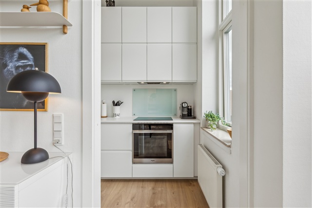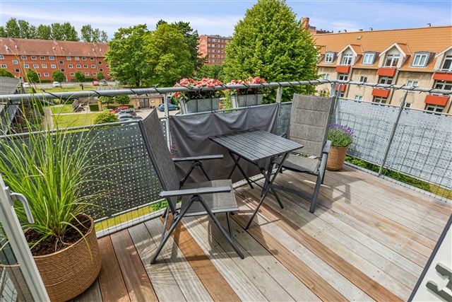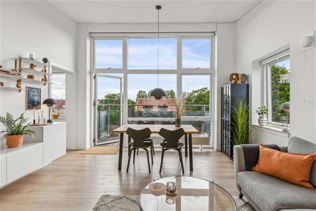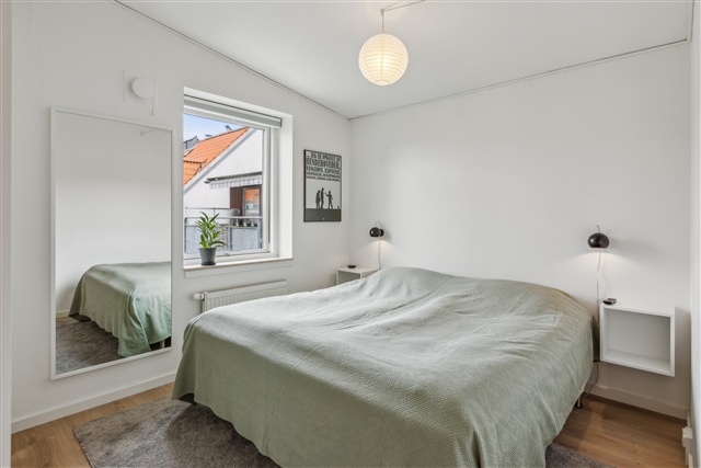 Bedst egnet til enlige lejere eller par.Lejligheden er attraktivt beliggende i en moderne ejendom med elevator, privat parkeringsplads, stort depotrum i kælder og en stor altan tilknyttet lejligheden. Lejligheden udlejes fuldt møbleret for en periode på op til 17 måneder.Man ankommer med elevator til øverste sal i ejendommen, hvor der er adgang til lejlighedens entre. Her er indbyggede skabe og god plads - og videre adgang til lejlighedens stuerum. Stuerummet er indrettet som både spise- og opholdsstue og har en fantastisk udsigt over nærområdet af store vinduespartier fra gulv til loft mod syd/vest. Her er også direkte udgang til en god og rummelig altan. Lejlighedens køkken er beliggende i delvist åben forbindelse med stuerummet og fremstår i flot og moderne stand, udstyret med alle nødvendige hårde hvidevarer.Lejlighedens soveværelse er i en god og rummelig størrelse og indrettet med en dobbeltseng og indbyggede skabe. Badeværelset er beliggende lige på den anden side af gangen og er ligeledes i fin og rummelig størrelse, udført med separat bruseniche og vaskefaciliteter.Der er gode fællesområdet tilknyttet ejendommen, samt en privat parkeringsplads i terræn til lejligheden. Der er et stort privat depotrum i kælderen og mulighed for overdækket cykelparkering.Lejligheden udlejes fuldt møbleret for en periode på op til 17 måneder. Udlejer ikke som delebolig. Bedst egnet til enlige lejere eller et par.