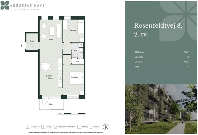 Områdets boliger kommer med forskellige planløsninger. Du finder boliger fra 57 til 123 kvadratmeter fordelt på på 2-, 3-, 4- og 5-værelses lejligheder. Alle lejlighederne åbner sig op med større vinduespartier mod syd og er meget lysfyldte. Desuden har de en loftshøjde på mere end 2,6 meter, og derfor opleves boligerne som både rummelige, luftige og eksklusive.Boligerne er udført i lækre kvalitetsmaterialer og med komplet hårde hvidevarepakke fra Siemens. I køkkenet og på badeværelset får du hvide HTH elementer, som også går igen på værelserne, hvor du har faste skabe. Til alle boliger hører et depotrum samt et kælderrum til opbevaring af de ting, som ikke skal fylde i hverdagen.Langs sydfacadens åbne grønne espalier-væg har alle lejlighederne et lækkert udeområde – i form af en stor altan eller i form af en privat terrasse i stueetagen. Her er der enten udsigt eller direkte adgang til det store skønne, grønne parkområde, Amalieparken.Den gennemgående grønne linje skaber ikke blot et smukt miljø, men også funktionalitet og velvære. For eksempel er trælamellerne og den grønne beplantning på den sydlige facade med til at danne uderum og skabe naturlig solafskærmning på altaner og terrasser. Tæt om sommeren og let om vinteren.Der vil i forbindelse med anmodning om leje af boligen, blive fortaget en kreditvurdering af kommende lejer ved anvendelse af CPR-nummer. Det er ikke tilladt at være registreret i RKI, hvis man vil leje en bolig.OBS! Billederne er ikke fra den specifikke bolig.