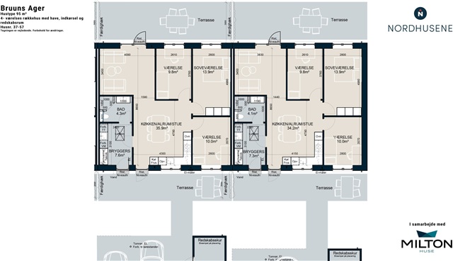 På Området møder du dette rækkehus, hvor funktionalitet og hygge går hånd i hånd – et hjem, der er skabt til den rolige, praktiske hverdag, men også til de små stunder, hvor der skal være plads til at nyde.En velkommen i hverdagspraktikHusets indgang sker gennem det rummelige bryggers – et praktisk rum, hvor der både er opbevaring, bordplads og klargjort til vaskemaskine og tørretumbler. Herfra ligger badeværelset lige ved, indrettet i lyse materialer, formstøbt vask og væghængt toilet. En planløsning, der gør hverdagen nem og flydende.Det store opholdsrum – husets hjerteTræder du videre, åbner det store køkken/alrum/stue sig. Rummet er dejligt lyst med vinduer mod begge terrasser, så lyset bevæger sig frit gennem dagen. Her er god plads til både spisebord og sofazone, og den åbne indretning gør det nemt at være sammen – uanset om middagen simrer i køkkenet eller der slappes af i sofahjørnet.Køkkenet er opført i glat hvid finish, komplet med kvalitets-hvidevarer, induktionskogeplade og indbygningsovn. Stænkplade og robuste laminatbordplader giver det hele en praktisk elegance.Tre værelser – fleksible rammerFra opholdsrummet fordeler boligen sig i tre velproportionerede værelser:– et lyst soveværelse med tre faste skabe,– samt to gode værelser, oplagte som børneværelse, kontor eller gæsteværelse.Alle rum har egeplank-laminat, glatte vægge og brede vinduer, som giver en let og behagelig atmosfære.To terrasser – morgen- og aftensolDet særlige ved boligen er de to store terrasser på hver sin side af huset.Her kan du starte dagen i stilhed på den ene side og afslutte den i aftensol på den anden. Terrasserne gør det let at indrette små uderum med plads til både kaffe, grill og grønt.Alt det praktiske følger medTil boligen hører et 7 m² redskabsrum, oplagt til haveredskaber og cykler, samt to private parkeringspladser. Der er desuden forberedt tomrør til ladestander til elbil.Praktisk infoBoligareal: 95 m²Opført: 2022Værelser: 3 + køkken/alrum/stueTerrasser: To – én på hver side af husetHave: PrivatUdhus: 7 m² redskabsrumParkering: 2 pladser (Forberedt til el-ladestander)Gulvvarme i hele husetVentilationsanlæg for sundt indeklimaIndividuelle forbrugsmålereOpvarmning via fjernvarmeHusdyr tilladt mod godkendelse