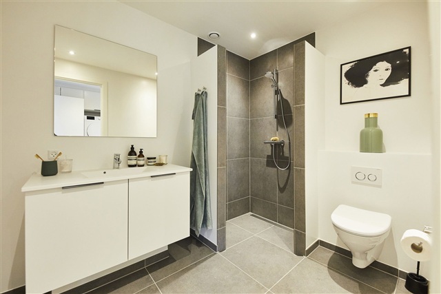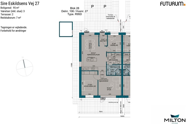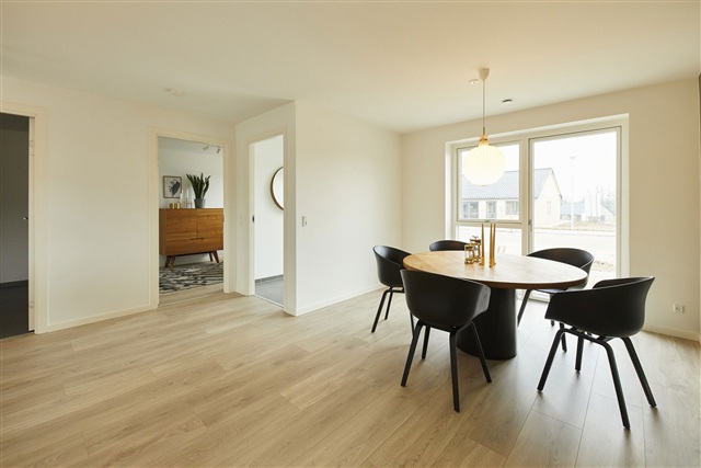 Velkommen indenforPå Sire Eskildsens Vej finder du dette moderne dobbelthus, hvor funktionalitet og atmosfære går hånd i hånd. Allerede fra den separate entré mærkes roen fra de lyse materialer og det fine lysindfald, der kendetegner hele hjemmet.Køkken, alrum og stue i ét flowFra entréen træder du ind i boligens hjerte: det store køkken/alrum og stue. Det stilrene HTH-køkken står med hvide fronter, antracitgreb og en praktisk køkkenø, der binder rummet sammen og skaber et naturligt samlingspunkt.Den åbne forbindelse til stuen gør det let at indrette en hyggelig sofakrog, og de brede vinduespartier giver et smukt, naturligt lys. Fra stuen er der direkte udgang til terrassen og haven – en skøn forlængelse af opholdsrummet i sommerhalvåret.Gennemtænkt bryggers og moderne badFra alrummet ligger bryggerset, indrettet med vask, bordplads, teknik og plads til vaskemaskine og tørretumbler. Herfra føres du videre til det moderne badeværelse med formstøbt vask, væghængt toilet, kvalitetsarmaturer fra Hans Grohe og linjeafløb i brusenichen.To gode værelserBoligen rummer et stort soveværelse med skabsvæg samt et ekstra værelse på 8,3 m² – oplagt som børneværelse, kontor eller gæsteværelse. Begge rum ligger afskærmet fra opholdsrummet og giver en god fordeling af privatliv og fællesliv.Uderum med plads til livetEgen have, stor terrasse og redskabsrum på 7 m² giver dig masser af muligheder for opbevaring, udeliv og afslapning. Foran huset har du to private parkeringspladser med forberedt tomrør til ladestander.Praktisk info95 m² | 3 værelser | Opført i 2023Egen have + stor terrasseRedskabsrum 7 m²2 p-pladser ved boligen (forberedt til ladestander)Gulvvarme i hele husetVentilationsanlæg for sundt indeklimaAlle hårde hvidevarer + vaskemaskine og tørretumblerHusdyr tilladt mod godkendelse