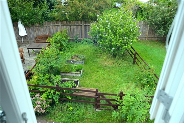 Lejligheden har en stor åben grundplan, stor stue, spiseplads og køkken. Det har også en lille, østvendt altan (med en frodig tomatplante), og i baghaven får du din helt egen have - stor, indhegnet, så der er rigelig mulighed for at nyde solskin.