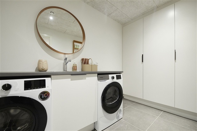 Dejligt lyst og moderne rækkehus med entre & bryggers i ét, udstyret med husets teknik samt vaskemaskine og tørretumbler. Fra entreen træder man ind i boligens rummelige køkkenalrum og stue i ét, hvor man herfra kan tilgå boligens moderne badeværelse, det store soveværelse samt værelse. Fra stuen er der udgang til den bagvedliggende terrasse.Have: Egen have og terrasseUdhuse: Redskabsrum 7m²Parkering: Fælles parkeringAl forbrug afregnes direkte til forsyningsselskaberneÅbne og lyse rækkehuseAlle række- og dobbelthuse er indrettet lyse og venlige med Troldtekt-lofter og filtede, hvide vægge. Dejlige vinduer for ekstra godt lysindfald overalt. Gulve af egeplank (laminat) i køkken/alrum, stue og værelser. Entré, bryggers, badeværelse og brus er udført med lækre klinkegulve i mørkegrå. Alle døre i glat, hvid finish med rustfri stålgreb og uden dørtrin for optimal adgang. Vindueskarme er murede og vandskuret i hvid. Vægge mod gulv er afsluttet med hvide, glatte fodpaneler.Fine detaljer overaltKøkken, bad, bryggers og soveværelse er med moderne HTH-moduler i glat, hvid afslutning og med antracit linjegreb. Bordplader i praktisk laminat i farven ’rustik skifer’ med rummelige stålvaske. Stænkplade bag kogepladen for nem rengøring. Vask i badeværelse af formstøbt materiale. Væghængt toilet fra Ifö Sign, kvalitetsarmaturer fra tyske Hans Grohe og linjeafløb i bruseniche.Kvalitetshvidevarer Alle hvidevarer medfølger i anerkendt kvalitet. Ovn er indbygget i højskab samt med integreret køle-/fryseskab og opvaskemaskine.Der forefindes vaskemaskine og tørretumbler i bryggers.Fast og god belysningDer er etableret lyskilde i bad og bryggers samt ved ventilation på loft. I køkken er der spot i overskabene.Opladning af el-bilDer forefindes flere ladestandere på de fælles parkeringsområder i bebyggelsen.Sundt indeklima og gulvvarmeDer er gulvvarme i hele rækkehuset. Dette styres via separate termostater i alle rum. Boligen er udført med ventilationsanlæg, der sikrer et sundt og godt indeklima.Individuelle forbrugsmålereForbrug til el (varme) og vand afregnes direkte mellem lejer og forsyningsselskaberne. Spildevand betales aconto sammen med huslejen. Opvarmning sker via luft-til-vand varmepumpe.Udvendigt findes der stikkontakt og vandhane samt væglampe ved entrédør.Seniorvenlige boligerHele etape 1B er udført som seniorvenlige boliger, dvs. husene er forberedt til evt. montering af hjælpemidler. Her kan bl.a. nævnes forstærkninger i loft til evt. montering af lift, tilpasset brusekabine, niveaufri passage i boligen, forstærkning af vægge til montering af hævesænke system i køkken og bad m.v.