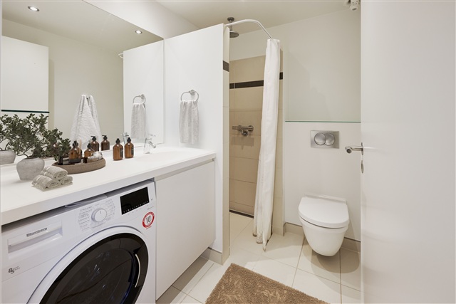 • Stort badeværelse med lyse klinker, masser af skabsplads, væghængt toilet samt kombineret vaskemaskine og tørretumbler