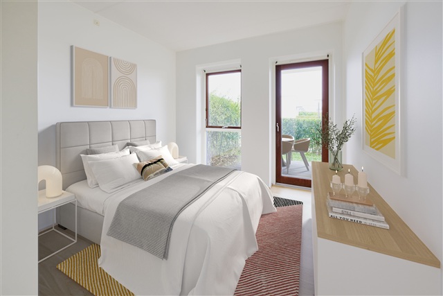• To regulære værelser. Det ene med indbyggede skabe og fra begge værelser er der udgang til lejlighedens store terrasse.