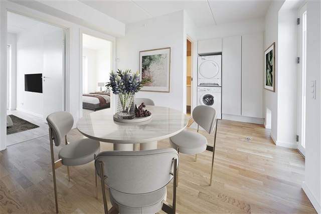 Overalt i lejligheden er der gulvvarme og et virkelig dejligt lysindfald, der gennemstrømmer lejligheden fra begge sider. Ved indflytning medfølger desuden alt i hårde hvidevarer.