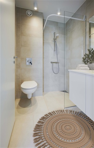 • Badeværelse med stor glasbruseniche og væghængt toilet