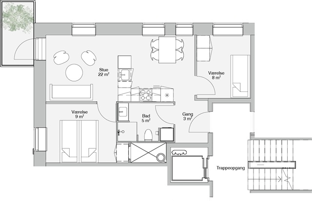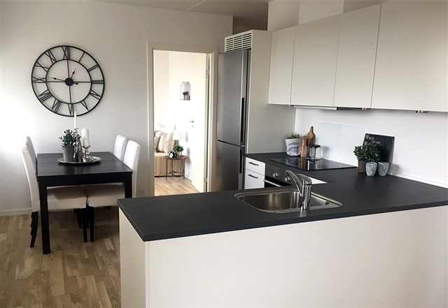 De velindrettede 3-værelses lejligheder er indrettet med en stue i åben