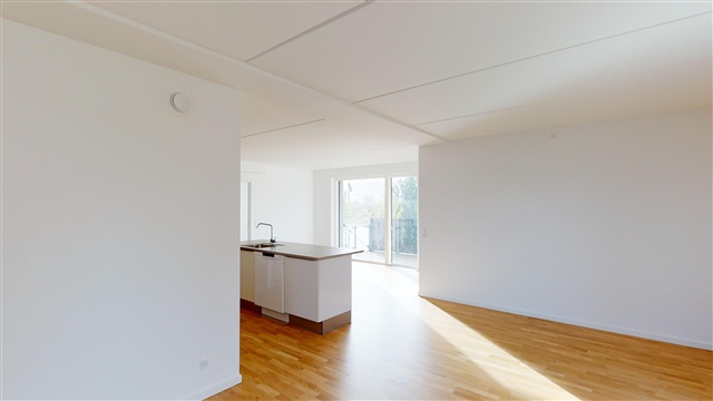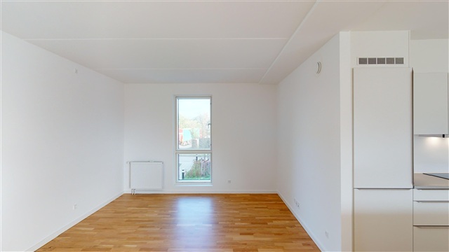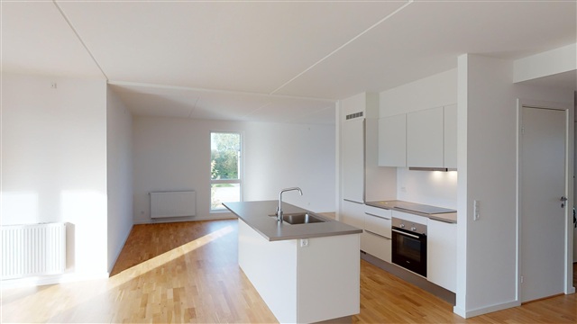 Når du træder ind i lejligheden, bliver du mødt af det åbne køkken-alrum, der