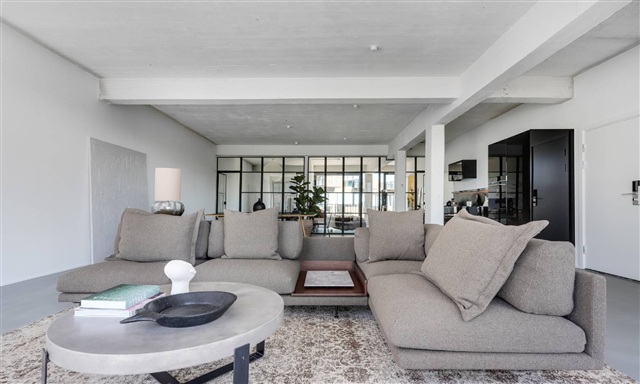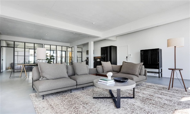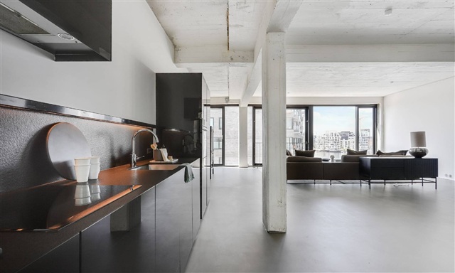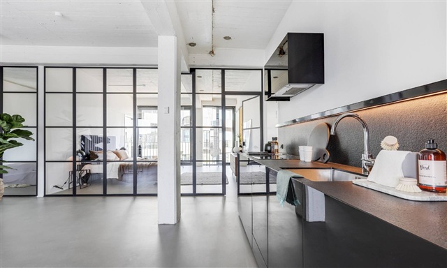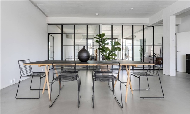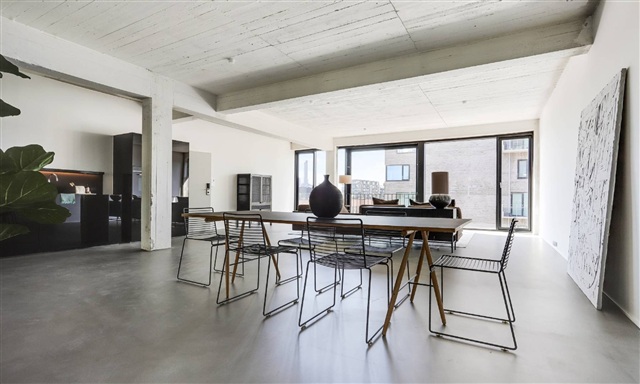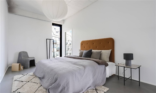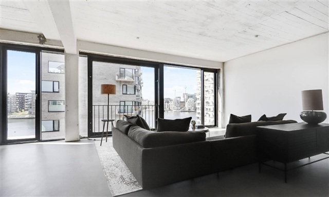 Denne særlige lejlighed i det karakteristiske A-hus kombinerer moderne arkitektur med en lys og luftig atmosfære. Boligens hjerte er et rummeligt køkken-alrum med store vinduespartier, som ikke blot sørger for rigeligt dagslys, men også åbner op for en smuk udsigt over vandet. Her skaber de robuste søjler og det fine panorama rammerne for både hyggelige morgener og afslappende stunder.Rumoplevelsen i køkken-alrummet er generøs med plads til spisearrangement samt et sofaområde. Lejligheden råder over to velindrettede, rummelige værelser, der kan anvendes som soveværelse og kontor, eller eventuelt til børn. Badeværelset fremstår lyst og moderne med et enkelt, stilrent udtryk, og lige bag køkkenet findes et mindre rum med vaskesøjle. Denne bolig byder på et fleksibelt og utraditionelt indretningspotentiale takket være de mange kvadratmeter, hvorved kreativ pladsudnyttelse er mulig. A-husets lejligheder henvender sig til dem, der sætter pris på det rå, industrielle look med højt til loftet og store åbne rum, der tilsammen skaber en særdeles rummelig boligoplevelse.