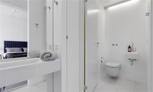 Vær opmærksom på, at billederne kan stamme fra en anden bolig i ejendommen, og derfor kan indretning, beliggenhed og udsigt variere. Materialevalg og kvalitet er dog ens for alle lejligheder i A-huset. Plantegningen vedhæftet viser netop denne boligs specifikke indretning.