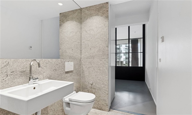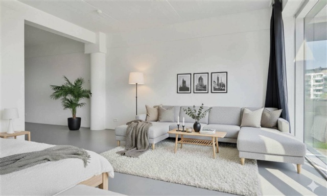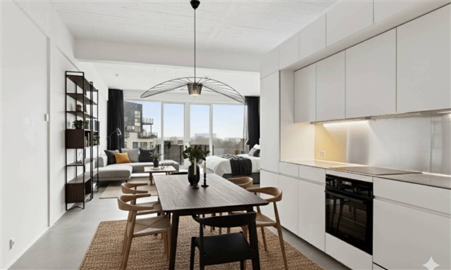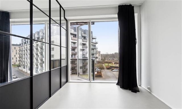 Det skal bemærkes, at de viste billeder kan stamme fra en anden lejlighed i ejendommen, hvilket betyder, at indretning, udsigt og placering kan variere mellem boligerne. Materialevalg og kvalitet er dog ensartet for samtlige boliger i ejendommen. Plantegningen illustrerer den konkrete boligindretning. Desuden er de møblerede billeder AI-genererede.