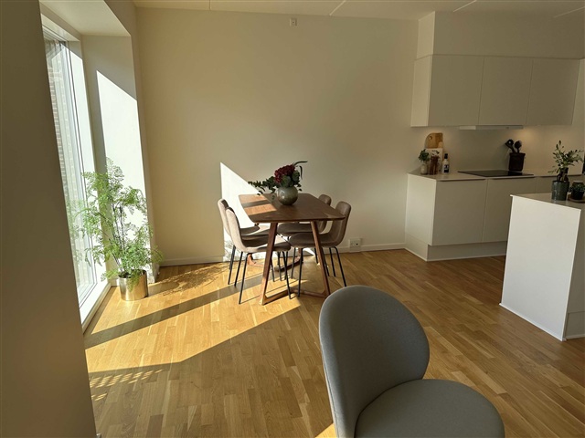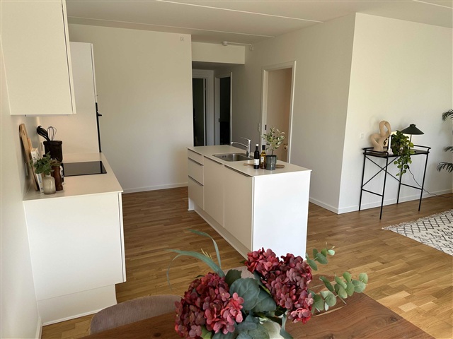Allerede i entréen mærkes boligens imødekommende flow. Herfra åbner hjemmet sig mod et centralt gangareal, der binder planløsningen harmonisk sammen og skaber en fin adskillelse mellem opholdsrum og private zoner.Det store køkken-alrum er lejlighedens hjerte – et åbent, lyst rum med masser af plads til både madlavning, samvær og hverdagens små ritualer. Køkkenet er praktisk indrettet med god arbejdsplads, og den naturlige forbindelse til spisepladsen gør det let at være fælles om aktiviteterne. I forlængelse af alrummet ligger stuen, hvor brede vinduespartier sikrer et skønt lysindfald dagen igennem.Fra stuen træder du ud på den sydvendte altan, der fungerer som et ekstra opholdsrum i sommerhalvåret. Her får du sol det meste af dagen – perfekt til morgenkaffen, eftermiddagsafslapning eller middage under åben himmel. Beliggenheden på 3. sal giver både privatliv og en behagelig afstand til byens rytme.Boligen rummer to regulære værelser, begge med gode indretningsmuligheder til enten soveværelse, børneværelse eller hjemmekontor. Badeværelset er veludnyttet med separat brus og vaskesøjle, og derudover finder du et praktisk depotrum, der gør opbevaringen lettere og hverdagen mere overskuelig.Alt i alt en moderne og funktionel lejlighed med en flot balance mellem fællesrum og private zoner – og ikke mindst en altan, der forlænger boligen ud i lyset.Hertil vil der være gratis p-pladser for alle beboere ved Dalum Papirfabrik.Bemærk venligst at plantegningen er vejledende med forbehold for små ændringer. Billederne viser ikke det pågældende lejemål, men derimod et udvalg af billeder fra møblerede prøveboliger.