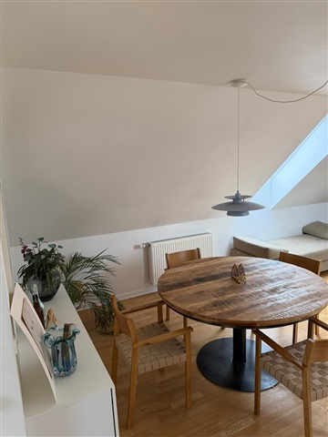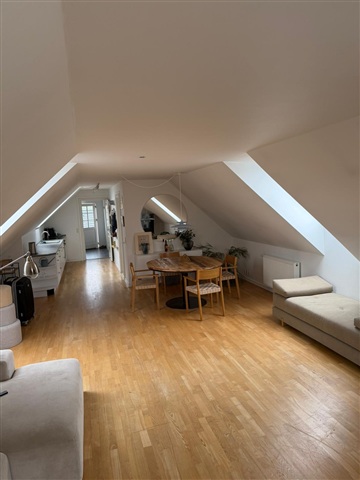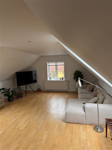 Lejligheden ligger i en separat bygning ved siden af hovedbygningen. Lejligheden har ét værelse og en stor stue/køkken alrum. Lejligheden har et stort badeværelse og indgang. Der er en mindre trappealtan lige ved indgangen med plads til 2 stole. Den store stue kan man opdele, så der er mulighed for at lave ekstra værelse.Lejligheden ligger på første sal. Der er eget vaskerum med vaskemaskine og tørretumbler i stueetagen.