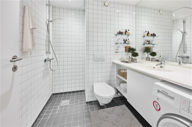• Lækkert badeværelse med gulvvarme, god skabsplads og kombineret vaskemaskine og tørretumbler