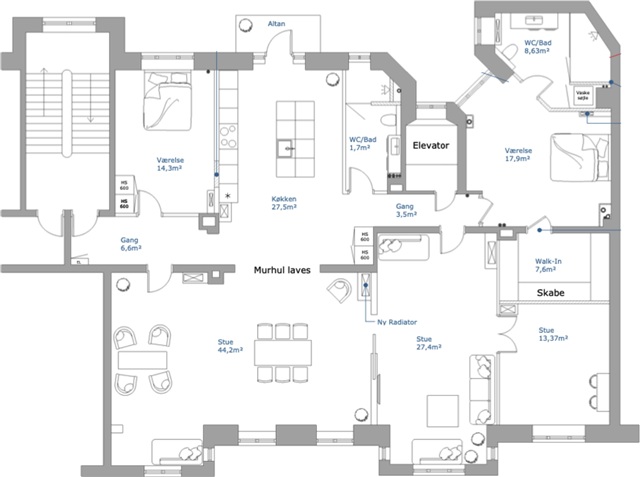 Lejligheden indeholder: Rummelig entré. Et fantastisk køkken/alrum, hvor væggen ind til stuen er slået ned, hvilket giver et skønt lys gennem lejligheden. Køkkenet er et Designa-køkken med alle hårde hvidevarer og god skabsplads. Fra køkkenet er der adgang til en altan mod den hyggelige gård. To skønne, lyse værelser – ét mod gården og ét mod Frederiksberg Allé. Stort master bedroom mod gården med adgang til privat walk-in-closet og badeværelse med bruseniche og vaskesøjle. To vidunderlige stuer med fantastisk lysindfald. Skønt gæstebadeværelse med stor bruseniche og vindue mod gården.