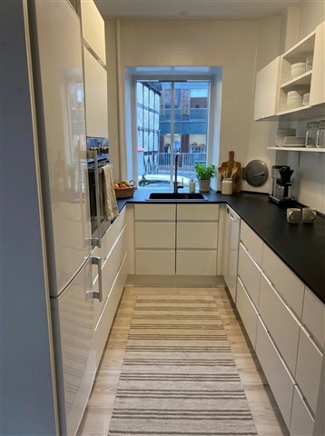 Køkkenet består af lyse skabselementer og er udstyret med et kombineret køle- og fryseskab samt en opvaskemaskine. Herfra er der desuden en terrassedør ud til en lille altan, som kun har plads til eksempelvis en enkelt blomsterpotte eller krydderurter. Fra opholdsrummet er der udgang til en rummelig altan, som rummer et lille bord og en stol og samtidig byder på en glimrende udsigt over Randers og mod Randers Regnskov.