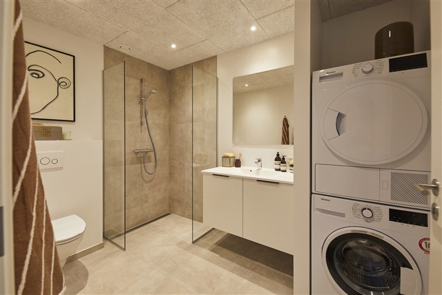 En velkomst, der føles rarDu træder ind i en lys og rummelig entré, hvor fuld skabsvæg giver plads til alt det, der ellers hurtigt roder: jakker, sko, støvsuger og hverdagens småting. Her er tænkt funktionelt fra start – og stadig luft nok til en bænk eller ekstra opbevaring, hvis du ønsker det.Hjemmets naturlige samlingspunktFra entréen fortsætter du lige ind i det store og åbne køkken/alrum og stue. Et lyst og venligt rum, hvor vinkelkøkkenet ligger perfekt trukket lidt til siden, så spiseplads og stue får lov at leve frit.Køkkenet er udført i moderne, hvide elementer og med alle hårde hvidevarer integreret – alt fra opvaskemaskine til induktion og ovn i god kvalitet. Her er masser af arbejdsplads og et skønt lysindfald, der gør madlavningen lidt hyggeligere.I forlængelse af køkkenet åbner stuen sig som et naturligt opholdsrum med store vinduespartier mod terrassen. Her kan du skabe præcis den stemning, du drømmer om – et roligt sofahjørne, et læsehjørne eller bare et sted, hvor dagen får lov at lande. Fra stuen er der direkte udgang til terrassen, som hurtigt bliver stedet, hvor sommeraftenerne forlænges.To gode værelser – plads til både ro og fleksibilitetFra alrummet finder du først et dejligt værelse, oplagt til kontor, børneværelse eller gæster.Længere inde ligger soveværelset – rummeligt, roligt og med indbyggede skabe, der gør indretningen let og overskuelig.Badeværelse med alt det praktiskeBadeværelset er indrettet i lyse, moderne materialer med formstøbt vask, kvalitetsarmaturer, væghængt toilet og en rummelig bruseniche med linjeafløb. Her står også vaskemaskine og tørretumbler – selvfølgelig inkluderet i lejemålet.Praktisk infoBoligareal: 85 m², opført i 20243-værelses rækkehusRedskabsrum ca. 7 m²Fælles parkering ved bebyggelsenAlle hvidevarer medfølger (køl/frys, opvaskemaskine, ovn, induktion, emhætte, vaskemaskine & tørretumbler)Gulvvarme i hele boligenVentilationsanlæg for sundt indeklimaHusdyr tilladt efter godkendelseForbrug afregnes direkte til forsyningsselskaberneUdvendig stikkontakt, vandhane og lampe ved entréFælles ladeløsning til elbil ved parkeringspladserne