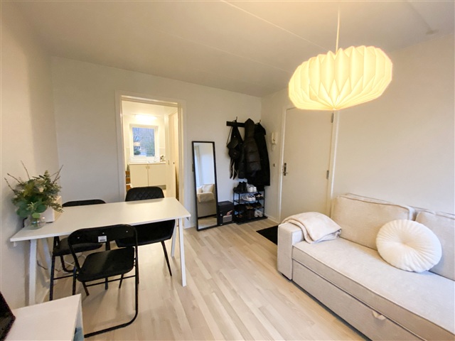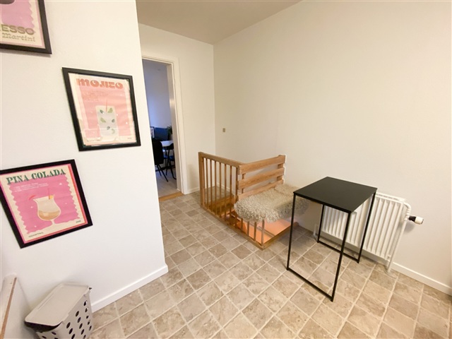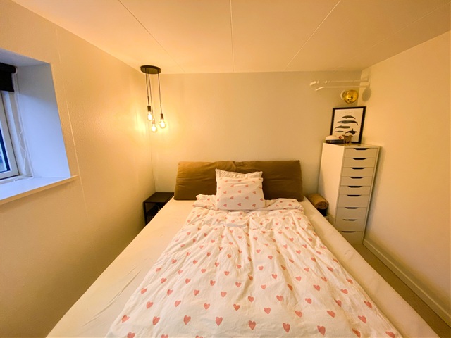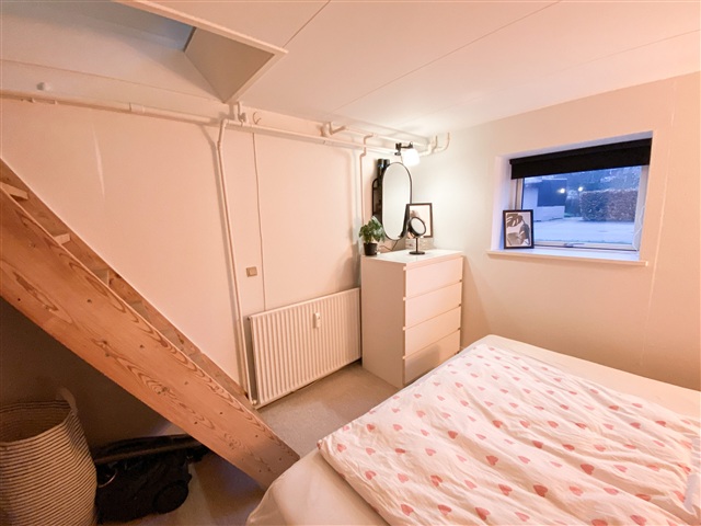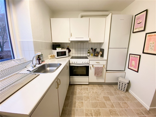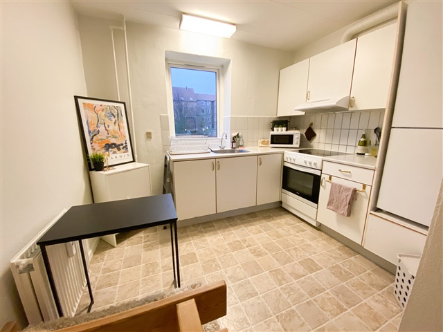 Velkommen til denne charmerende høje stuelejlighed, hvor du straks bliver mødt af en hyggelig stue. I hjørnet er der praktisk plads til overtøj og sko, mens resten af rummet nemt kan indrettes med en sofa, tv og opbevaringsløsninger. Fra stuen er der direkte adgang til et dejligt, lyst køkken, som er godt udnyttet i forhold til lejlighedens størrelse. Ved trappen i køkkenet er der lavet en hyggelig bænk, der indbyder til at skabe et spiseområde.Badeværelset, der også tilgås fra køkkenet, byder på separat bruseniche og en rummelig indretning. Via trappen i køkkenet kommer du ned til lejlighedens soveværelse, som er rummeligt nok til en stor seng og har flere kreative muligheder for opbevaring af tøj.