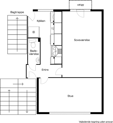 Lejlighedens entre grener ud til alle af lejlighedens 4 rum. Lige frem for indgangen ligger lejlighedens badeværelse som er lille men funktionel. Næste efter kommer et lille hyggeligt køkken med opvaskemaskine og udgang til bagtrappen.