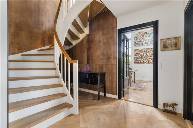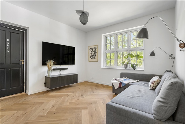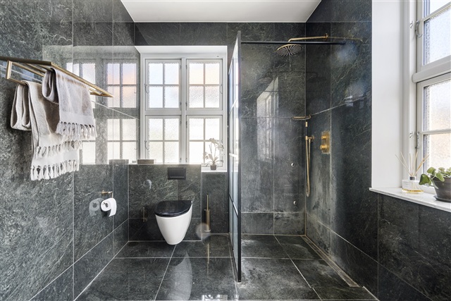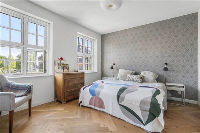 Førstesalen rummer tre værelser af generøse mål, alle udstyret med indbyggede skabe og store vinduer, der bidrager til rummeligheden. Derudover er der et repos med plads til møbler og et ekstra rum, der kan anvendes til hjemmekontor, tv-stue, legerum eller lignende formål. Badeværelset er stilfuldt indrettet med mørke sten og messingdetaljer og byder på en god størrelse.