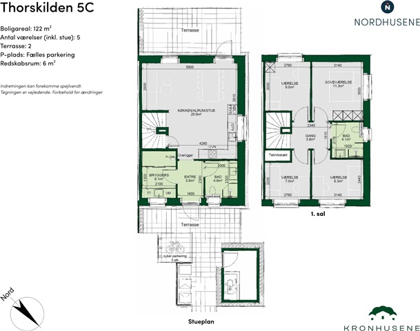 Udendørs kan man nyde to terrasser, hvoraf den ene vender mod morgensolen, og den anden mod aftensolen, hvilket giver gode muligheder for udeliv og afslapning. Til boligen hører desuden en fælles parkeringsplads, cykelparkering samt et redskabsrum på 6 m². Samlet set udgør boligen en moderne og rummelig familiebolig, hvor kvalitet, funktionalitet og hverdagsglæde vægtes højt i rolige og grønne omgivelser.