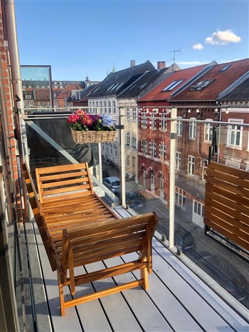 Ejendommen rummer en elevator og byder på en fælles, stor tagterrasse, som alle beboere frit kan gøre brug af. Den attraktive lokation er yderst central, da der kun er 50 meter til Bruuns Galleri med nem adgang til tog og bus samt et bredt udvalg af specialbutikker og dagligvarebutikker. Billederne stammer fra en tilsvarende lejlighed, og mindre afvigelser kan forekomme.