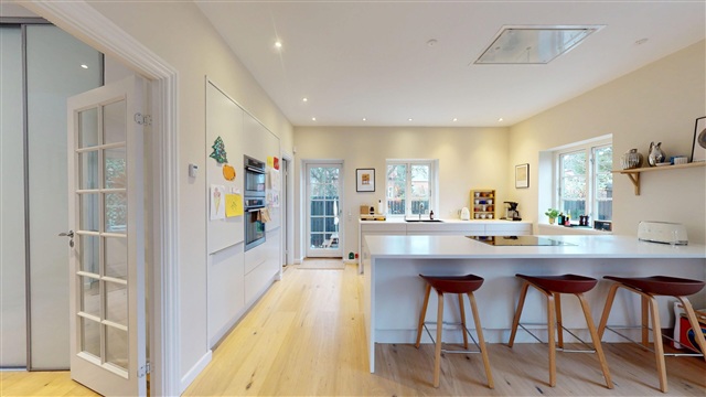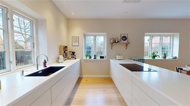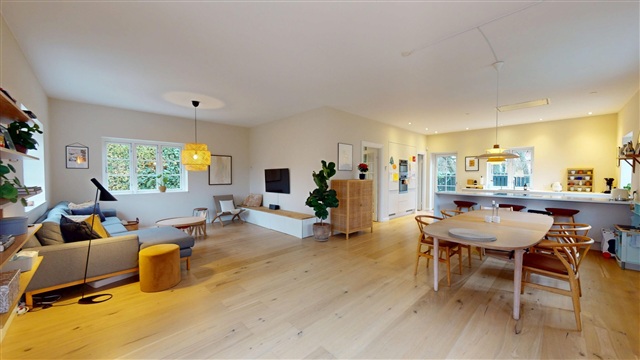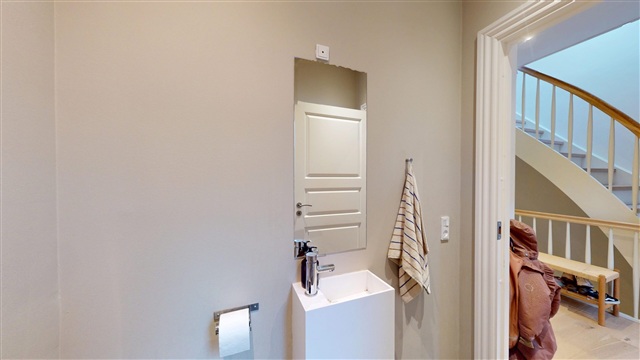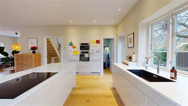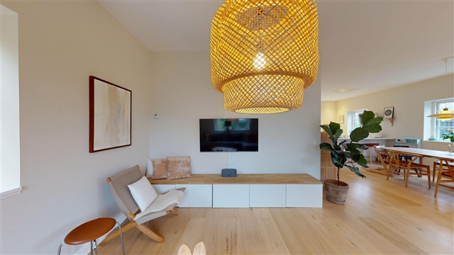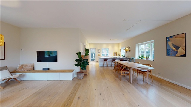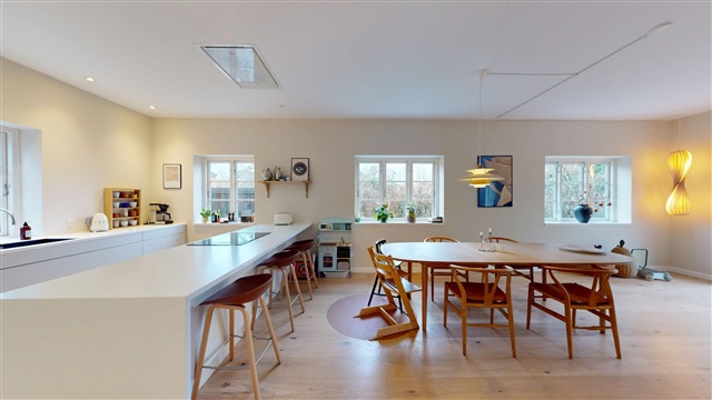 Entréen byder på et stort og indbydende rum med rig mulighed for opbevaring af både overtøj og sko. I tilknytning hertil findes et gæstetoilet, der er praktisk placeret og let tilgængeligt for både daglig brug og besøgende. Fra denne entré åbner boligens centrale del sig - et rummeligt køkken-alrum med højt til loftet og et enestående lysindfald, som bidrager til en åben og let atmosfære.Det moderne køkken er elegant og veludstyret med rigelig bord- og skabsplads, hvilket både fremmer madlavningen og det sociale samvær. Umiddelbart ved siden af køkkenet er der et anvendeligt viktualierum, som giver ekstra opbevaringsmuligheder og øger hverdagskomforten. Det store køkken-alrum rummer både en spiseafdeling og en opholdsstue, hvilket gør dette rum til samlingspunktet for familiens daglige liv.