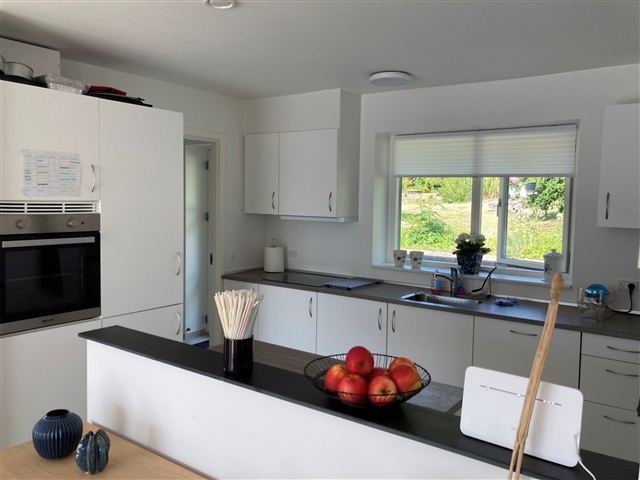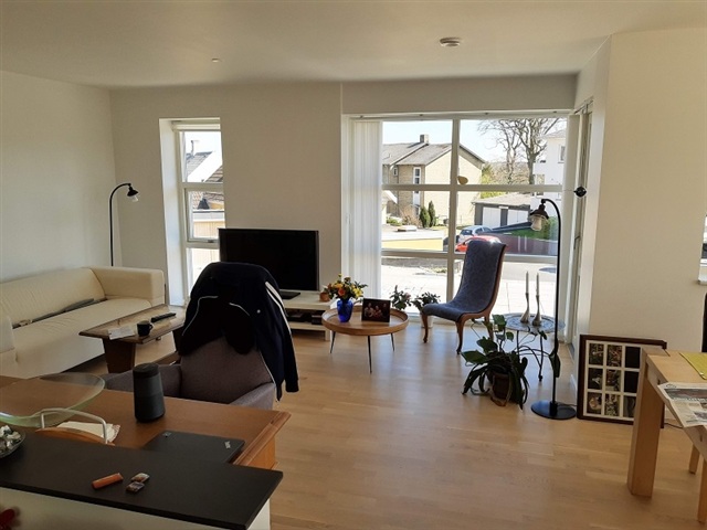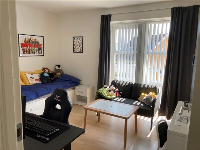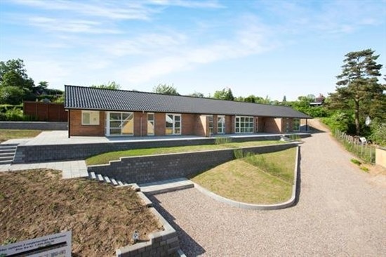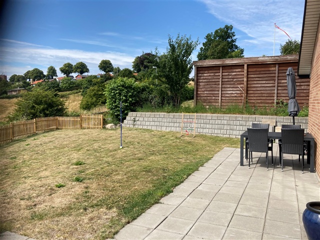 Dette moderne enderækkehus fra 2018/19 byder på 95 m² og ligger tæt på byens centrum. Indretningen omfatter et bryggers med integrerede skabe samt et køkken, der er åbent mod stuen og adskilt herfra af en halvmur. Stuen er lys og rummer plads til en spiseafdeling. Derudover findes en mellemgang, et badeværelse samt to værelser, begge med indbyggede skabe. Boligens gulv er dækket af varme i samtlige rum.Til ejendommen hører et privat redskabsskur, mindre græsarealer samt en stor terrasse med flisebelægning.