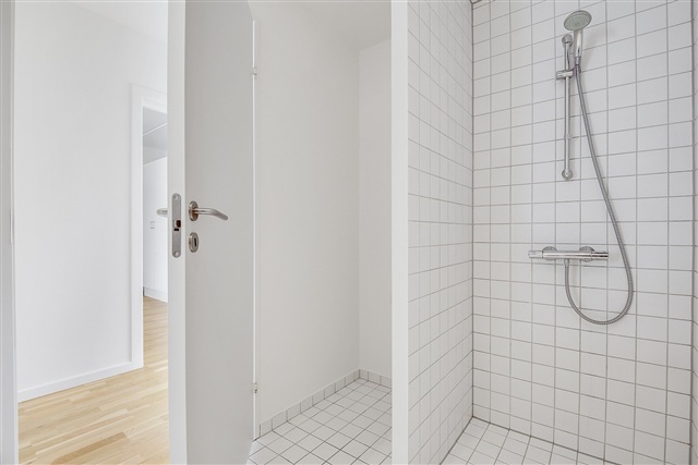 Badeværelset er lyst, rummeligt og præget af moderne design, som tilføjer en indbydende følelse.