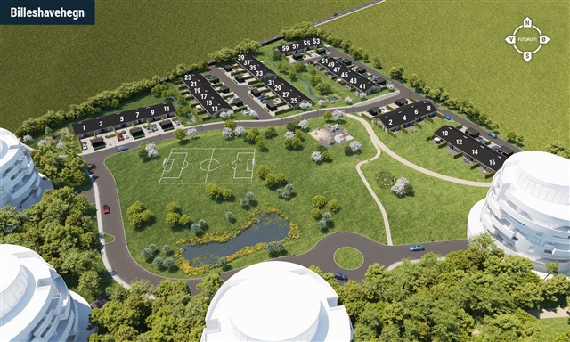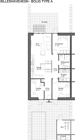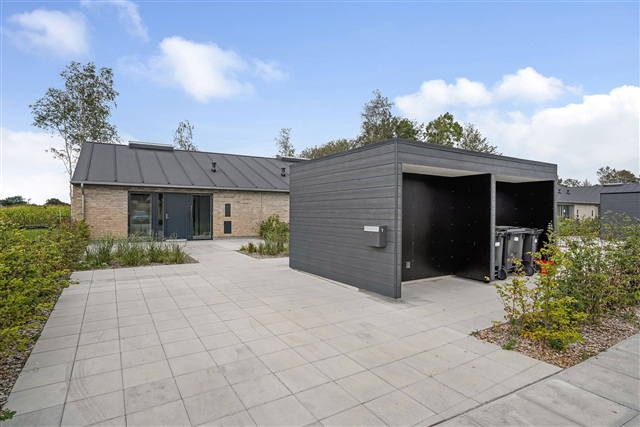 Indgangen åbner op til en rummelig og åben entre, hvor der er rig mulighed for opbevaring. Fra denne entré føres man videre til et værelse samt til husets imponerende køkkenalrum, som prydes af et højt loft til kip og et stort ovenlysvindue, der skaber et lyst og luftigt rum. Køkkenalrummet rummer plads til et spisebord og en hyggelig sofakrog ved det store vinduesparti, som vender ud mod boligens bagterrasse. En moderne og stilfuld New Yorker-væg adskiller spisepladsen fra gangarealet og skaber samtidig adgangen til bryggers, badeværelse, soveværelse og et ekstra værelse. Hver af værelserne har indbyggede skabe og adgang til enten for- eller bagterrasse.Til boligen hører en privat terrasse samt fælles haveareal, og der er et redskabsrum på 9,5 m² til opbevaring. Parkering er tilgængelig med en enkelt parkeringsplads ved boligen. Alt forbrug afregnes direkte mellem lejer og forsyningsselskaberne. Husene er generelt karakteriseret ved deres åbne og lyse atmosfære, hvor hvide vægge og akustiklofter med ekstra højdeniveau skaber et behageligt og støjdæmpende miljø. Store, oplukkelige vinduer sikrer et generøst lysindfald i samtlige rum. Opholdsarealerne, som omfatter køkken, alrum og stue, er udstyret med et stort vinduesparti mod terrassen for at maksimere dagslyset. Gulvene i disse rum består af lyddæmpende egeplanklaminat, mens bryggers og badeværelse samt brusenichen er beklædt med antracitgrå klinker. Alle indvendige døre har en glat, hvid finish med rustfri stålgreb og er uden dørtrin for at sikre nem adgang. Vægge afsluttes mod gulvet med glatte, hvide fodpaneler.