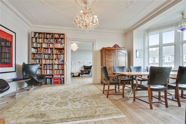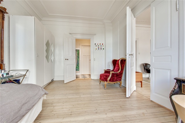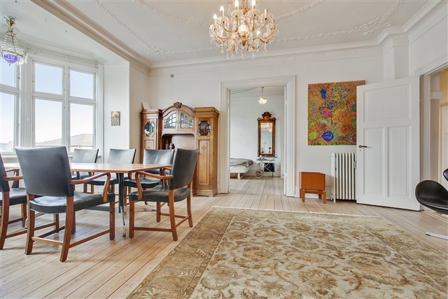 Lejligheden, som udlejes møbleret, har et areal på 157 kvadratmeter og indeholder tre separate soveværelser. Den ligger centralt på Frederiksberg, med metro, offentlig transport og butikker i umiddelbar nærhed. Boligen har en rummelig fordelingsgang, der forbinder alle rummene. Tre elegante stuer følger hinanden en-suite; én af disse kan med lethed indrettes som soveværelse. En af stuerne har desuden en pejs. Køkkenet er udstyret med rigelig opbevaringsplads og alle nødvendige hårde hvidevarer. Der er et mindre, lyst gæstetoilet samt et stort badeværelse, der både rummer badekar og vaskemaskine. Det store soveværelse har et rummeligt klædeskab og direkte adgang til en stor altan med udsigt over Frederiksberg. Et ekstra mindre værelse kan benyttes som enten soveværelse eller kontor.Parkering kan efter aftale stilles til rådighed af udlejer til en månedlig pris på cirka 875 kr. Det skal bemærkes, at boligen ikke udlejes som delelejlighed.