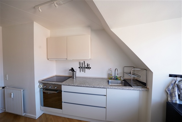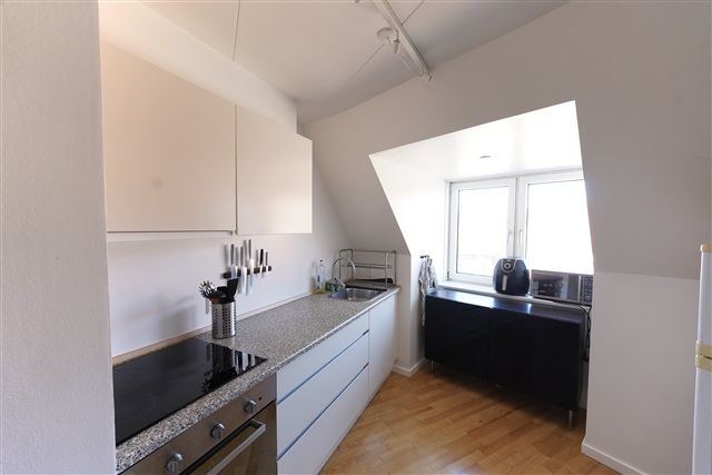 Når man træder ind i lejligheden, kommer man ind i en rummelig fordelingsgang, hvor der er god plads til at hænge overtøjet. Lejligheden rummer godt køkken med god arbejdsplads og hvidevare som kølefryseskab, komfur og emhætte.
