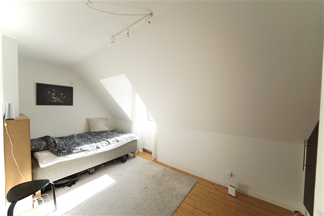 Lejlighedens soveværelse er ud mod gården. På soveværelset går man ikke ned på skabsplads med det store faste skab, som kan rumme alles garderobe.
