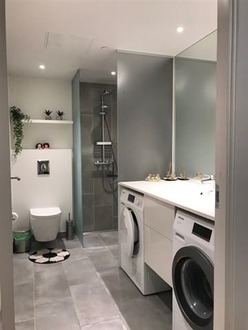 Badeværelset er indrettet med skuffemoduler og en vaskesøjle (vaskemaskine og tørretumbler fra Miele). Vægge og gulve er beklædt med grå fliser.