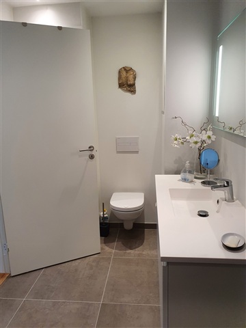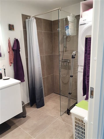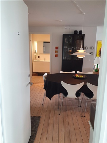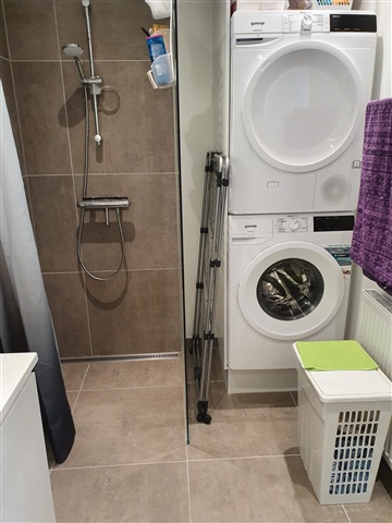 Overalt i lejligheden ligger der lyse gulve med skibsplanke, mens badeværelset er belagt med store fliser i betonlook. Badeværelset er udstyret med bruseniche og indbygget toilet. Alt el og VVS er fuldstændig nyt, og væggene fremstår glatte og hvide.