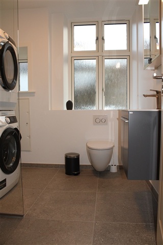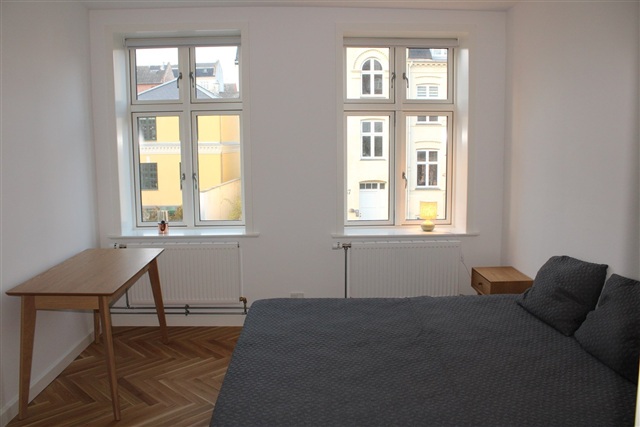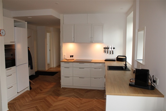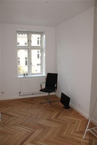 Denne lejlighed er fuldstændig nyistandsat og befinder sig på en meget eftertragtet adresse på Frederiksberg C. Den ligger i en fredelig og grøn sidegade til Gammel Kongevej, omgivet af klassiske bygningsfacader og velplejede forhaver, hvilket skaber en stemning, der både er traditionel og charmerende landsbyagtig. Ejendommen, der består af tre etager og kun tre lejligheder, rummer denne lejlighed på 1. sal.Boligen er designet med stor sans for både æstetik og funktionalitet. Det store, åbne køkken og alrum indeholder et rummeligt spiseområde med plads til et stort bord, der glider naturligt over i stuen. Stuen er opdelt i to separate områder via franske døre, hvoraf det ene fungerer som en klassisk sofaafdeling, mens det andet, mindre rum kan anvendes som bibliotek, Tv-stue eller hjemmearbejdsplads. Soveværelset er generøst og udstyret med dobbeltseng og skrivebord, mens et yderligere værelse, der kan benyttes som gæste- eller børneværelse, også er af god størrelse. Endvidere findes et mindre værelse, der er indrettet som kontor. Badeværelset er rummeligt og indeholder smukke rustikke grå klinker samt både vaskemaskine og tumbler.