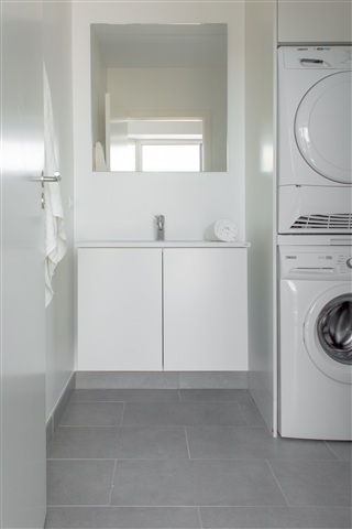 Beliggende blot en kvart times kørsel fra København finder man Teglskovshusene og dette flotte 4-værelses rækkehus, som er opført med materialer af høj kvalitet i en enkel og moderne stil. Boligen præsenterer sig med store vinduespartier og lyse overflader, der skaber et åbent og luftigt udtryk.Huset er indrettet over to plan med en åben planløsning. I stueetagen møder man en lys og indbydende entré, der rummer plads til sko og overtøj. Herfra er der åbent ind til et kombineret køkken- og opholdsrum, hvor køkkenet er udstyret med grebsfrie fronter, en glaskeramisk kogeplade samt indbygningsovn, som sikrer funktionalitet og æstetik. Endvidere findes et toilet med væghængt Ifö-toilet og en praktisk vaskesøjle.