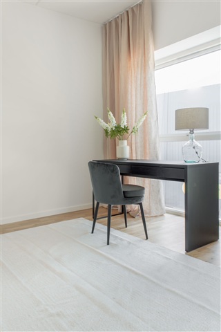 Rækkehuset er præget af et enestående lysindfald gennem de store vinduer, og trægulvene med gulvvarme udstrækker sig over hele boligens areal. I alle rum er der monteret hvide rullegardiner, som bidrager til at regulere lysindfaldet efter behov.