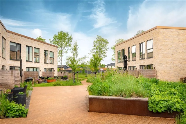 Udendørs er der mulighed for at nyde privatlivet i den egen gårdhave, samtidigt med at de grønne fællesarealer giver plads til socialt samvær i et fredeligt og hyggeligt nabolag.