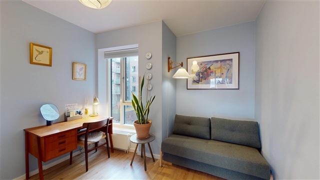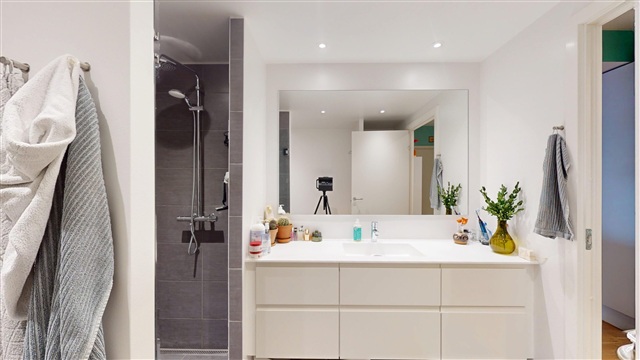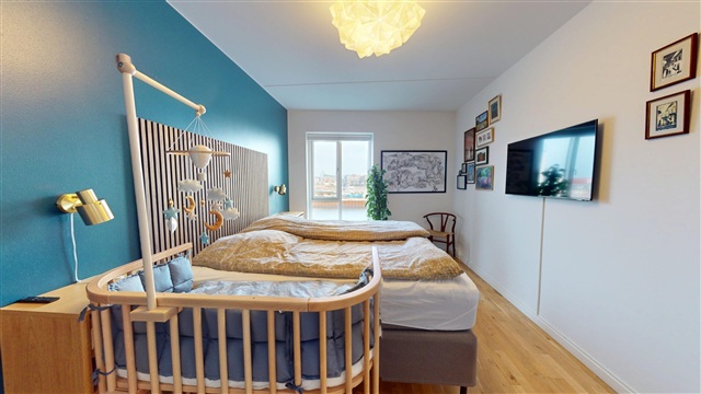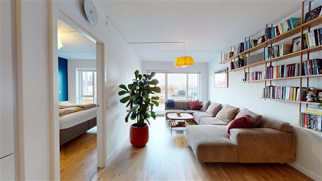 Lejlighedens rummelige køkken-alrum udgør hjemmets centrale område, hvor både dagligdagens aktiviteter og gæstebesøg får god plads. Det åbne og lyse rum er udstyret med et moderne køkken, der byder på veltilrettelagte arbejdsområder og rigelige opbevaringsmuligheder. Herfra er der direkte udgang til de to værelser samt til den store altan, som byder på gode muligheder for at nyde frisk luft, slappe af og tilbringe hyggelige timer med udsigt over havnen.Denne boligs to værelser er begge af god størrelse. Det ene egner sig særligt godt som soveværelse, mens det andet er møbleret med en funktionel sovesofa, hvilket gør det velegnet som gæsteværelse, hjemmekontor eller et fleksibelt rum efter behov. Badeværelset er stort, lyst og stilrent indrettet, og det indeholder både vaskemaskine og tørretumbler, hvilket sikrer en praktisk og bekvem hverdag.