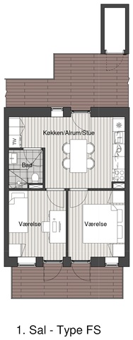 Beliggende i et boligområde, der appellerer til en varieret gruppe bestående af singler, unge par, små familier samt yngre seniorer, er denne bolig særligt egnet til deleformål og derfor også attraktiv for studerende. Området ligger tæt på flere af byens uddannelsesinstitutioner, hvilket øger sådanne muligheder. Det er et godt valg for dem, der ønsker følelsen af at bo i et hus, men uden besværet ved at vedligeholde en stor have eller parcel.En markant detalje ved boligerne er de utraditionelle vinduespartier, som bryder med de klassiske og ofte ensformige designs. De varierede former og placeringer skaber et levende og spændende udtryk set udefra. Samtlige boliger er præget af et lyst og indbydende miljø med en ensartet, stilren æstetik gennem alle rum. Gulvene er belagt med matlakeret egetræs lamelparket overalt, undtagen badeværelset, som er udført med elegante klinker både på gulv og i den tilhørende bruseniche.