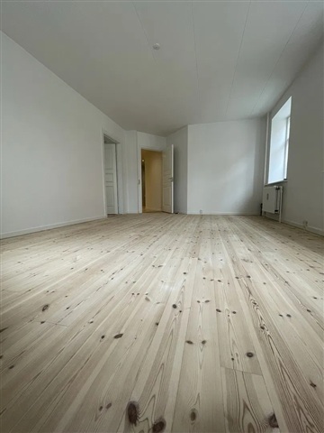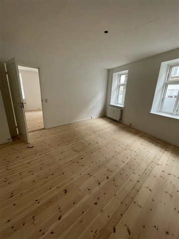 Lejligheden indeholder fire værelser, der alle er nemme at indrette og prydes af trægulve og naturligt dagslys. Det store badeværelse er velholdt med flisebeklædte vægge og en separat bruseniche, som tilsammen skaber en indbydende og praktisk løsning. Hertil kommer et bryggers med direkte adgang til en fredelig gård, hvilket giver ekstra komfort og anvendelsesmuligheder.