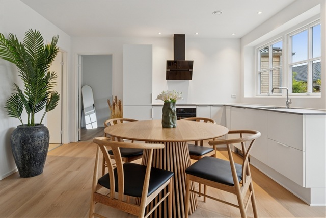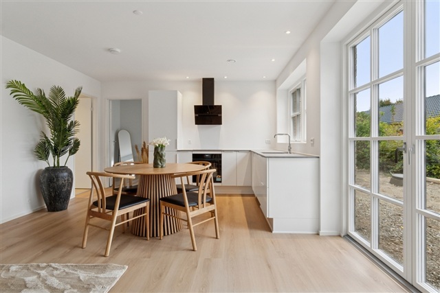 Indretningen er designet med fokus på komfort og funktionalitet. Køkken og badeværelseselementer stammer fra Svane, mens Siemens leverer alle hårde hvidevarer. Varmeforsyningen sker via en luft-til-vand varmepumpe, og der er gulvvarme installeret i samtlige rum, så komforten sikres uanset årstid.