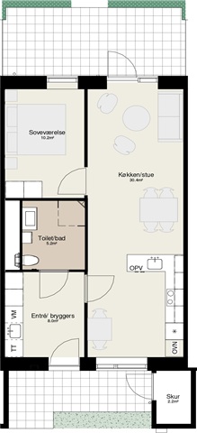 Uden for boligen ved indgangen er der et praktisk skur til opbevaring, mens de omkringliggende grønne fællesarealer giver rig mulighed for leg og ophold i det fri. Som beboer her bliver man del af et trygt og aktivt lokalsamfund, der blandt andet omfatter større legepladser samt et fælleshus, hvor der ofte afholdes aktiviteter for både børn og voksne. Plantegning og billeder af boligen er vejledende.