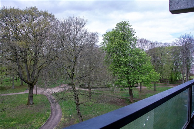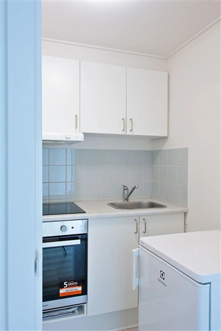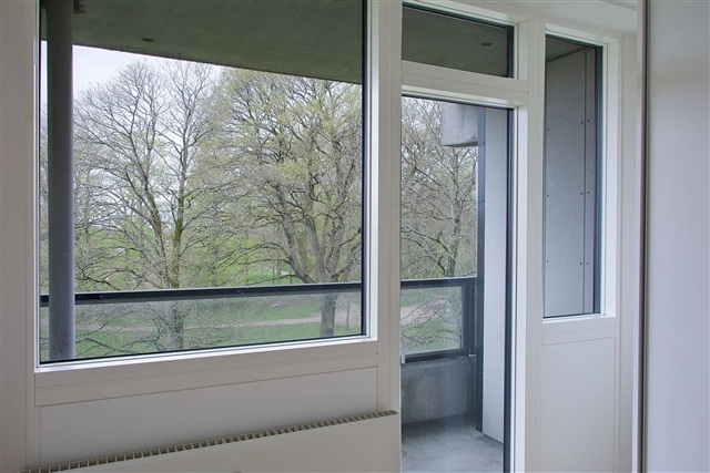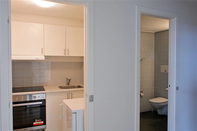 Lejligheden fremstår indbydende med en stor stue, hvor et omfattende vinduesparti sikrer et dejligt naturligt lysindfald. Soveværelset er udstyret med indbyggede skabe, der giver god opbevaringsplads, og der er direkte udgang til en altan med udsigt over grønne arealer. Badeværelset er udstyret med en bruseniche, og der findes et praktisk tekøkken i boligen.Selvom køkken og bad fremstår i en ældre stil, er boligen beliggende i et eftertragtet område med gode indkøbsmuligheder inden for kort afstand og kun 2 kilometer fra byens centrum. I ejendommen er der adgang til fælles vaskefaciliteter, et privat kælderrum til opbevaring samt mulighed for at leje en garage. Desuden er området forsynet med ladestandere til elbiler.