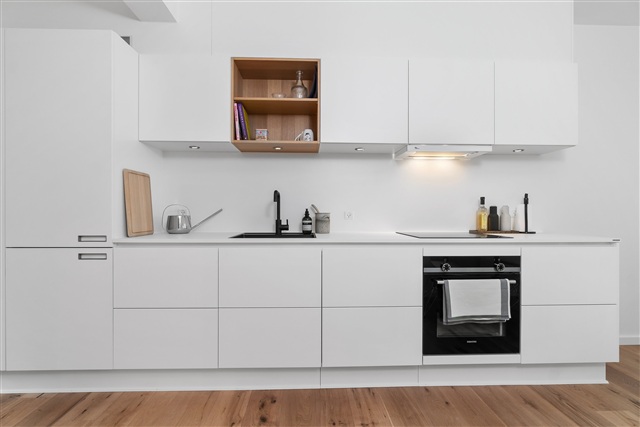 Boligen er designet af CEBRA-arkitekterne med fokus på kvalitet. Køkkenet er leveret af Svane Køkkenet og er en moderne fortolkning af det grebsløse, hvide køkken. Det er detaljeret med ekstra dybe skuffer med soft-close og fuldt udtræk, en 20 mm tyk bordplade samt en underlimet sort vask, som harmonerer med det sorte armatur. Alle hårde hvidevarer er fra Siemens. Der er elevator direkte til indgangsdøren, flotte egetræsgulve med gulvvarme, skønne altaner og badeværelser af høj standard.