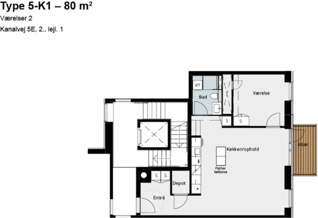 Bemærk venligst, at billederne ikke viser den konkrete lejlighed, men er ment til at illustrere den overordnede stil; plantegningen er derimod fra selve boligen.Lejligheden er indrettet med to værelser, herunder et soveværelse og et badeværelse, samt et rummeligt køkkenalrum, som udgør hjemmets centrale samlingspunkt. Boligen nyder godt af naturligt dagslys, der strømmer ind gennem velplacerede vinduer, hvilket skaber en lys og behagelig atmosfære.