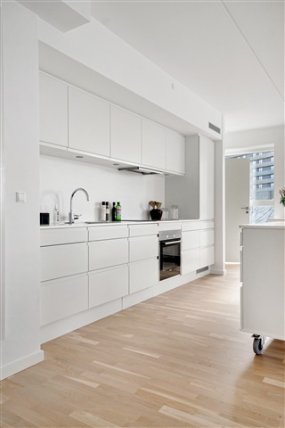 Køkkenet fremstår stort og er udstyret med lyse Invita-elementer i et elegant og tidløst design samt en komplet hvidvarepakke. Badeværelset følger samme stilmæssige linje med Invita-elementer, hvilket skaber en visuel rød tråd gennem hele lejligheden.